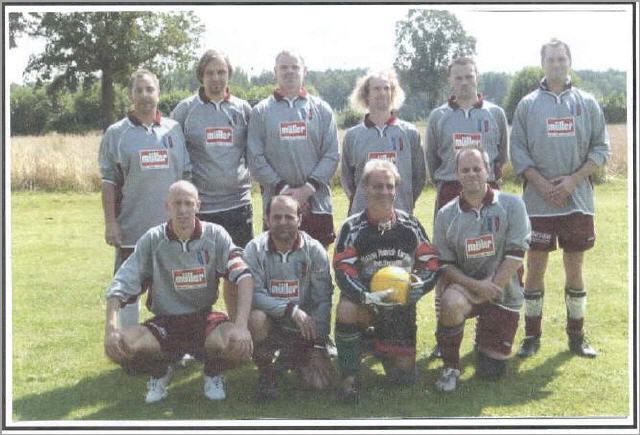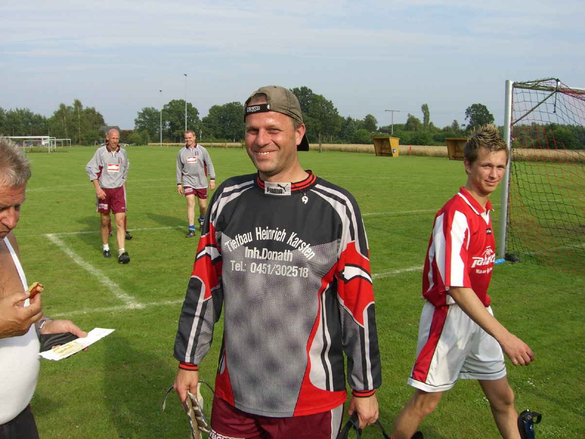 Wie gewohnt wurde das Turnier in 2 Gruppen ausgespielt. Gruppe 1 mit den Herrenmannschaften auf dem Großfeld und Gruppe 2 mit den "Alt-Herrenmannschaften" auf kleinerem Feld. Das Teilnehmerfeld der Gruppe 2 war identisch wie im Vorjahr, d.h. der Gastgeber SC Rothenhausen, SV Steinhorst, SV Rensefeld, Altona und unsere Mannschaft. Gespielt wurde diesmal aber mit 7+1, wodurch natürlich weniger Platz vorhanden war. Von Coach Max eingestellt begannen wir gleich im ersten Spiel gegen die Handballer vom SV Rensefeld. Im letzten Jahr noch ein enges Spiel wurde gleich zu Beginn deutlich, daß wir klar überlegen waren. Micha Hagi vorne hatte Chancen über Chancen, hinten die Abwehr stand gut und war kaum gefordert. Doch es dauerte lange, bis Ralf mit der Hacke aus einem Gewühl heraus das erlösende und verdiente 1:0 gelang. Danach machte dann Micha auch sein Tor und wir gewannen verdient mit 2:0. Ein gelungener Auftakt. Die stärkeren Gegner, das sahen wir schon als Zuschauer beim 2ten Spiel sollten folgen. Rothenhausen und Steinhorst trennten sich 0:0 und der Gastgeber war dann unser 2ter Gegner. Körperlich robust hatten wir einige Schwierigkeiten mit dem SC und gerade zu Beginn konnten wieder einige sehr gute Chancen nicht genutzt werden. So blieb es Micha vorbehalten an alter Wirkungsstätte gegen seine alten "Mitspieler" das entscheidende 1:0 zu machen. Es war ein wichtiger Sieg, denn nachdem Steinhorst gegen Altona klar mit 4:0 gewonnen hatte, wußten wir, das im nächsten Spiel gegen Steinhorst ein Uentschieden zum Gruppensieg reichen würde, vorausgesetzt wir gewinnen das letzte Spiel gegen Altona (Die hatten diesmal aber eine klar schwächere Truppe am Start, insbesondere ihr "Superstar" fehlte). Entsprechend defensiv und taktisch herrvorragend von Coach Max Merkel eingestellt begannen wir. Martin sollte den Spielmacher (ein alter Saufkumpel von Max?) ausschalten und das gelang. Das Spiel begann relativ ausgeglichen, ohne große Chancen auf beiden Seiten. Dann die Schrecksekunde als Ralf beim Laufen im Rasen hängenblieb und sich das Knie verdrehte. Ralf mußte mit Verdacht auf Kreuzbandriß ins Krankenhaus und das Spiel endete 0:0, was mich am Ende wenig interessierte. Im letzten Spiel reichte ein Sieg zum Gruppensieg und so wie Altona begann, war es viel zu einfach. Das "lustlose" hin- und hergeschiebe des Gegners führte zu Fehlpäßen und Hagi konnte früh das 1:0 machen. Sven und Ginne erhöhten, es hätte aber bei etwas mehr Genauigkeit in den Abspielen (Jo!) weitaus höher ausfallen können. Wir konnten also unseren Gruppensieg verteidigen und waren wieder im Endspiel. Einzig fuer Bony war es ein sehr trüber Tag, denn es kam so gut wie kein ernsthafter Schuß auf unser Tor. Fazit: Eine mannschaftlich starke Leistung, insbesondere die Abwehr, einzig die Chancenauswertung ließ zu wünschen übrig.